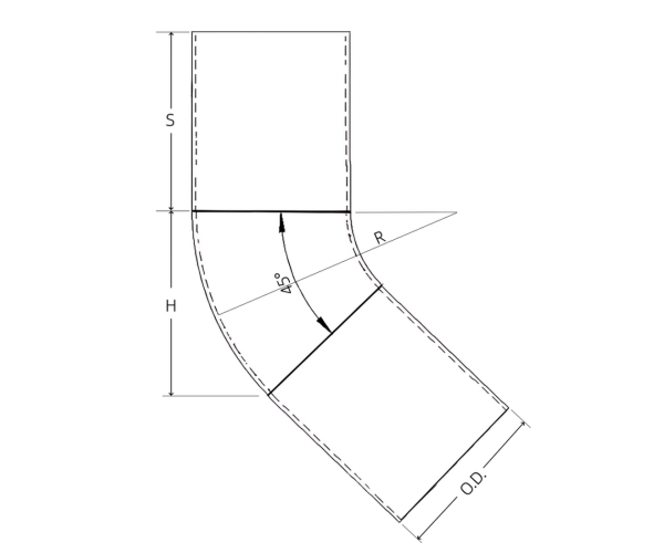 | Dobras de tubo de raio de 45 ° de comprimento | |